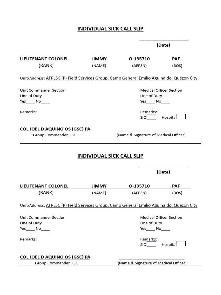 Web individual sick slip unit commander's section medical officer's section disposition of patient dd form 689, mar 1963 previous. Usappc v2.00 sick bay duty hospital. Web for questions related to directives, publications, and forms, please use the following email: A doctor’s note is a slip from a doctor or qualified healthcare provider certifying that an individual is ill and, therefore, unable to.
