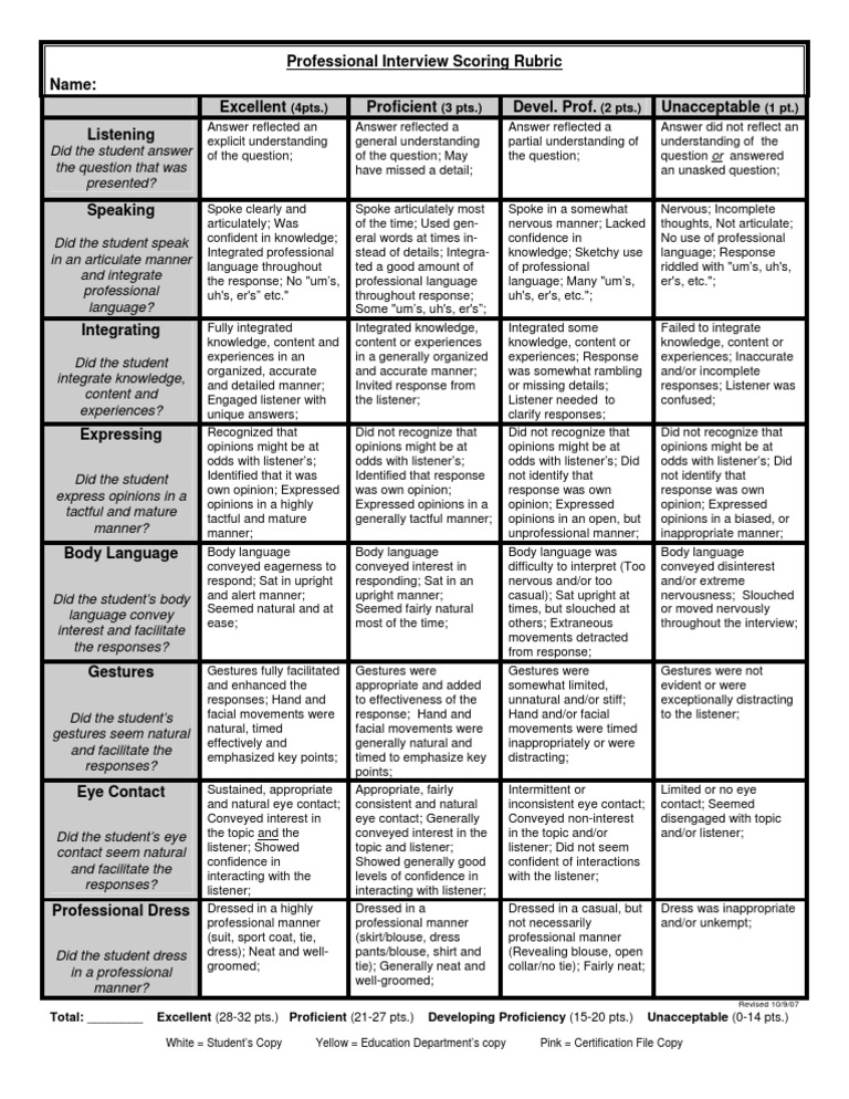 Clearly defined criteria specific to the position. The interview rubric works by providing a structured framework for evaluating candidates. This document contains several templates that can be used as models for standardizing your evaluation of interview results. Download interview rubric template here. They’re typically formatted as a table, with skills or specific questions on the left and space for scoring on the right (we’ll show you an actual scoring template later on in.