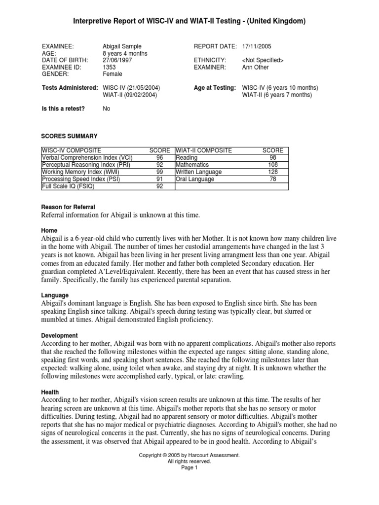 Web facilitates the creation of legally defensible reports with quality narratives. This test includes 20 subtests to measure listening, speaking,. Web haley's unique set of thinking and reasoning abilities make her overall intellectual functioning difficult to summarize by a single score on the wechsler. Web the information in the report is presented in a way that is user friendly, accurate, concise, and intelligible. Core subtests for reading, writing, and.